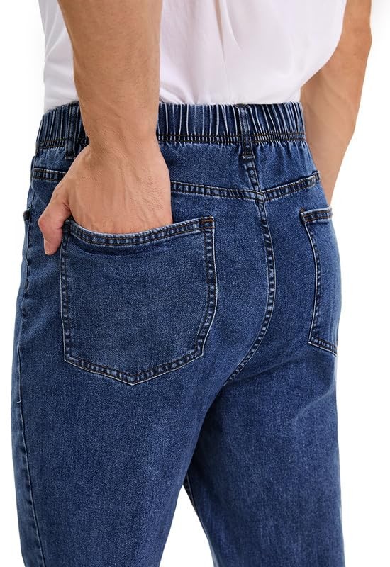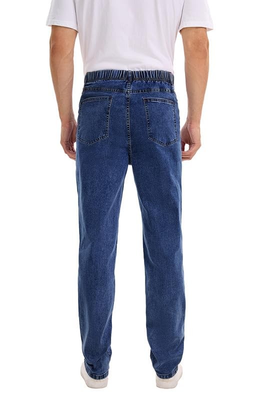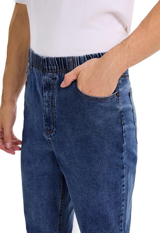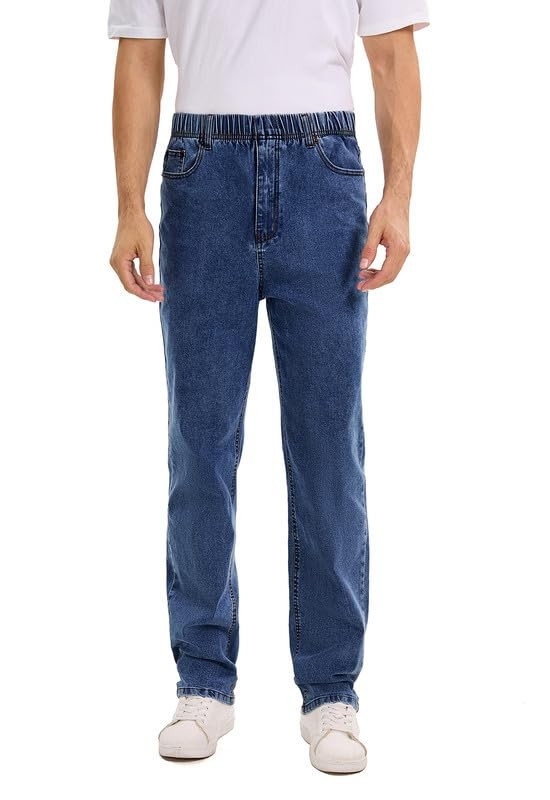 Queenspace Men's High Elastic Waist Jeans Relaxed Fit Straight Leg Stretch Denim Jeans with Zipper