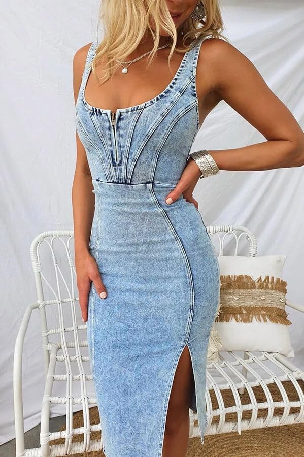 Queenspace Women's Denim Dress Sleeveless Side Slit Bodycon Midi Jean Scoop Neck Dresses